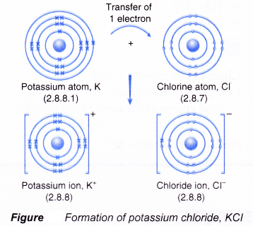 - Figure shows the transfer of one electron from a potassium atom to a chlorine atom to form the ionic compound potassium chloride.