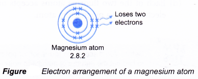 - Each magnesium atom loses two electrons from its valence shell to achieve a stable octet electron arrangement (similar to the noble gas neon). A positive ion, Mg2+ is formed.