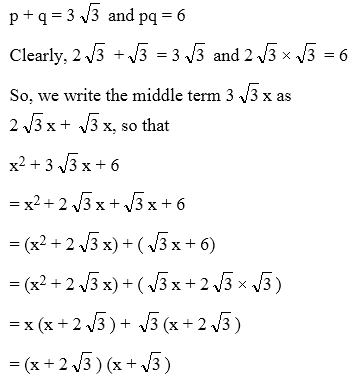 Solution: In order to factorize x2 + 3 √3 x + 6, we have to find two numbers p and q such that