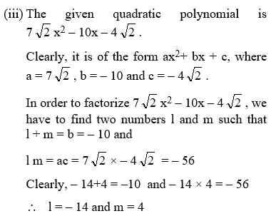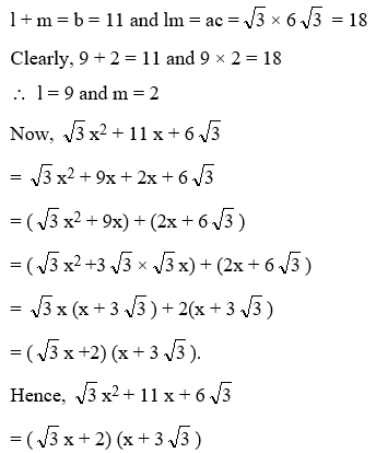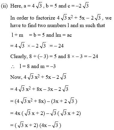 (ii) After finding l and m, we split the middle term bx as lx + mx and get the desired factors by grouping the terms.