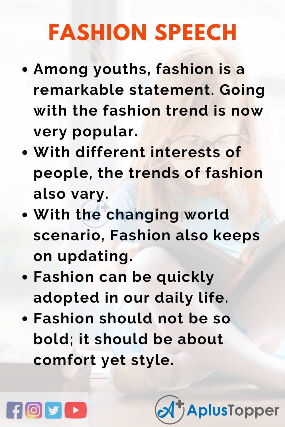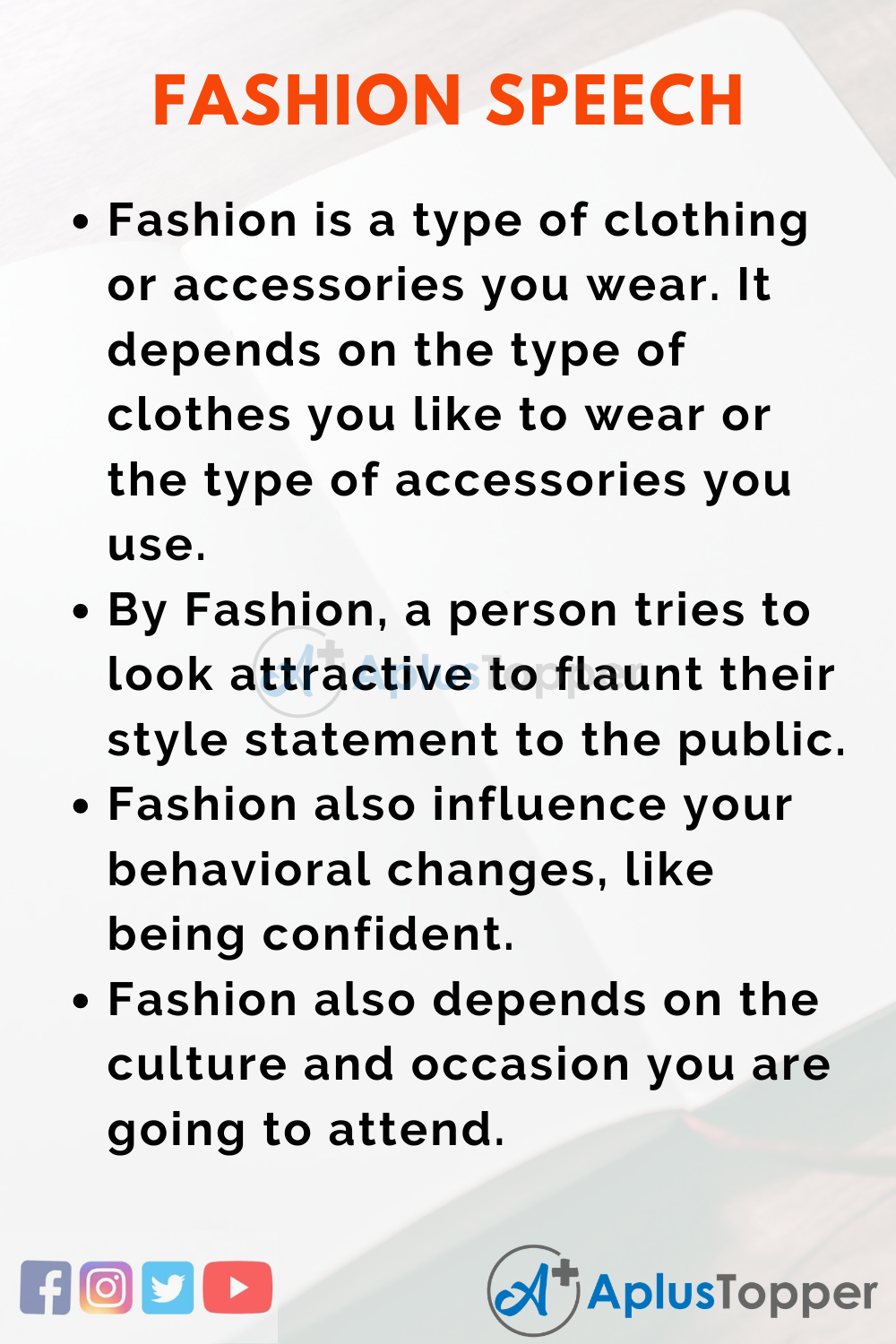 A Short Fashion Speech is helpful to students of classes 1, 2, 3, 4, 5 and 6. A Long Fashion Speech is helpful to students of classes 7, 8, 9, 10, 11 and 12.