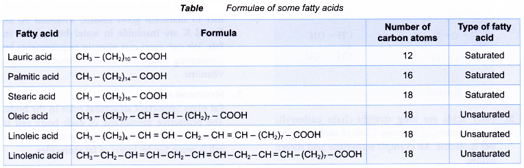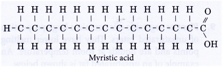 - Fatty acids are long straight-chain carboxylic acids containing between 12 to 18 carbon atoms per molecule. An example is myristic acid shown below.