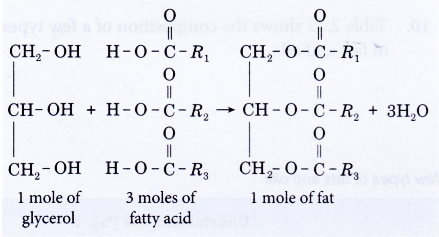 - A molecule of glycerol may combine with one, two or three fatty acids to form a monoester, diester or triester. A molecule of water is eliminated when a fatty acid joins to the glycerol molecule and the resulting bond formed is called an ester link (-COO-).