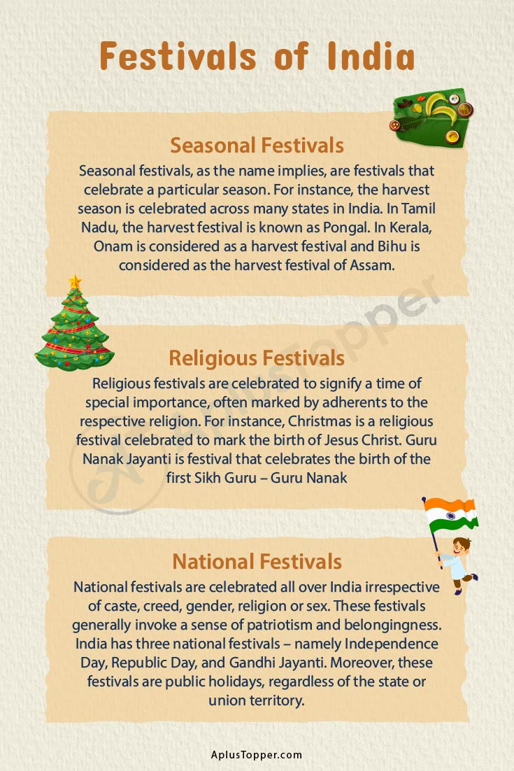 Seasonal Festivals: Seasonal festivals, as the name implies, are festivals that celebrate a particular season. For instance, the harvest season is celebrated across many states in India. In Tamil Nadu, the harvest festival is known as Pongal. In Kerala, Onam is considered as a harvest festival and Bihu is considered as the harvest festival of Assam.