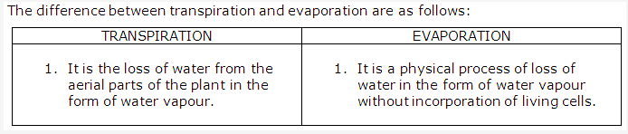 - The important difference between transpiration and evaporation is that transpiration is the loss of water from the aerial parts of the plant while evaporation is loss of water from any surface.