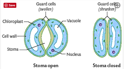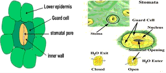 Mechanism of stomata: Stomata are small pores present on the leaves which contains two kidney-shaped guard cells. The opening and closing of stomata depends upon the changes in the turgidity of their guard cells. Due to absorption of water the guard cells become turgid.Their inner walls are pulled apart by their outer wall.The gap between the guard cells become wider and stomata open.When guard cells are flaccid due to loss of water, the outer walls are not stretched, their inner walls are not pulled apart decreasing the gap between the guard cells and stomata close.