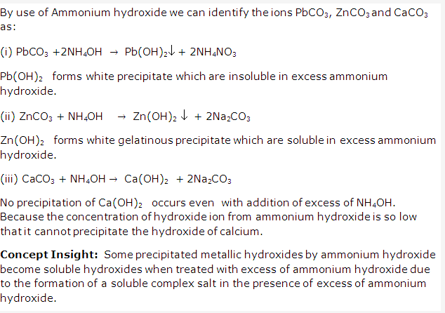 Lead carbonate is PbCO3and contains Pb2+ ions. Ammonium hydroxide solution NH4OH can be used to identify Pb2+ since its addition to lead carbonate solution will give white precipitates of Pb(OH)2 which are insoluble in excess of NH4OH. - Solution of Zinc carbonate: