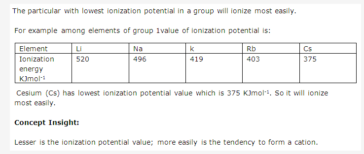 For example, group 1 elements Li, Na, K, Rb, Cs have tendency to lose the one electron present in their valence shell and form positive ions Li+., Na+., K+., Rb+.and Cs+.