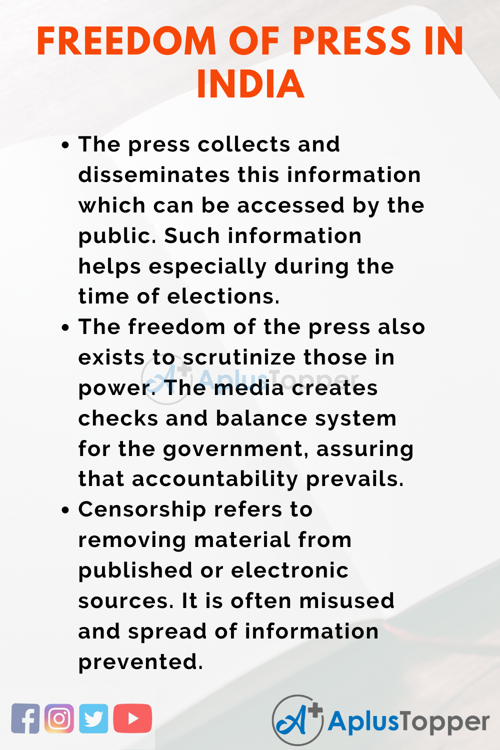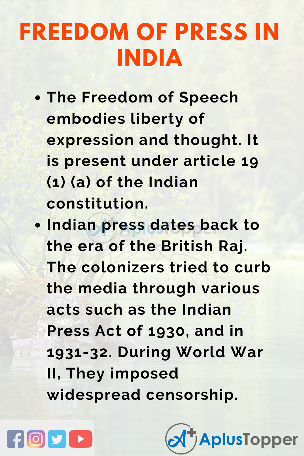 The press is an essential vehicle in any country. The media provides us with information from all over the world and makes them available to citizens. The freedom of speech and expression consists of the freedom of the press. This freedom of speech and expression allows every Indian to express their thought and views openly.