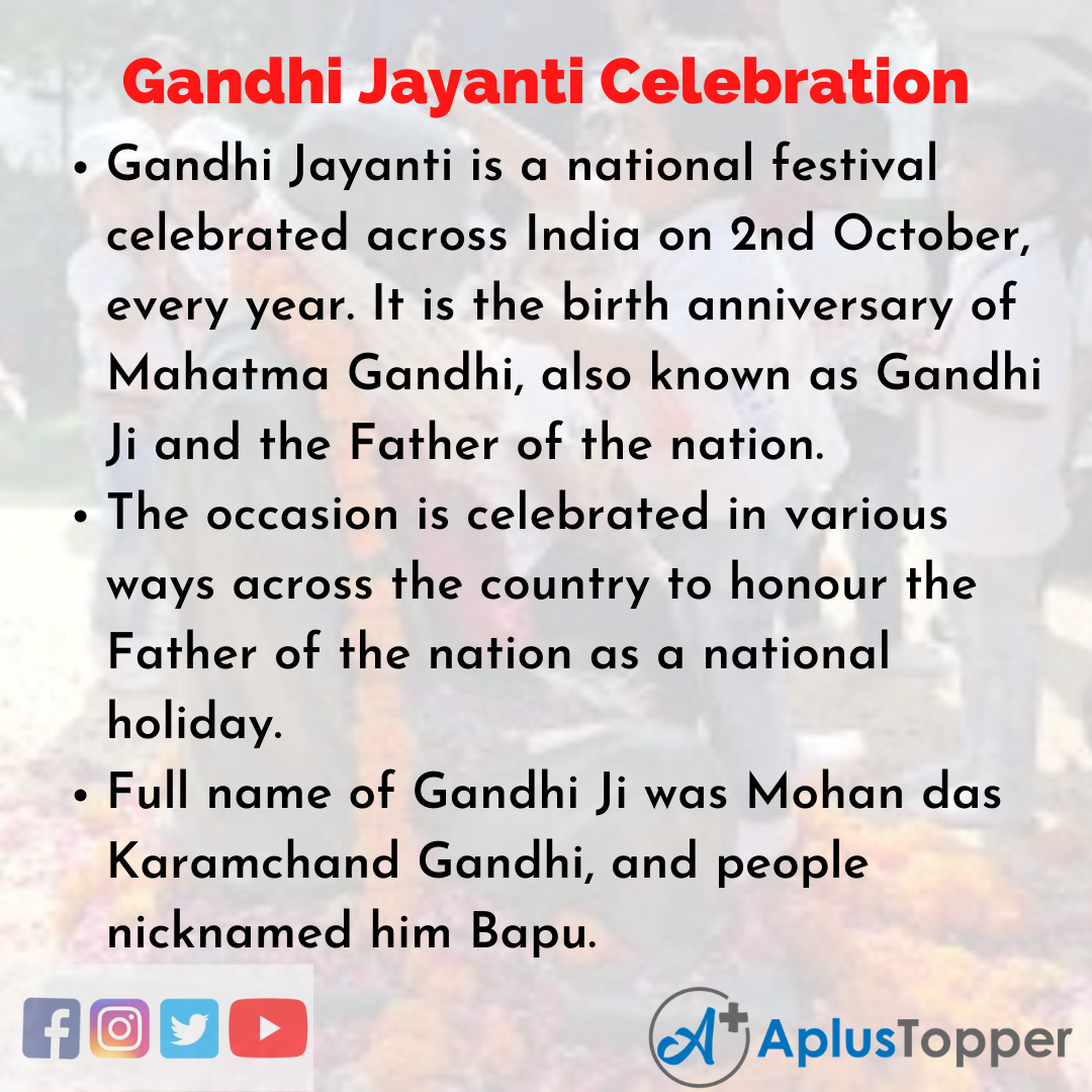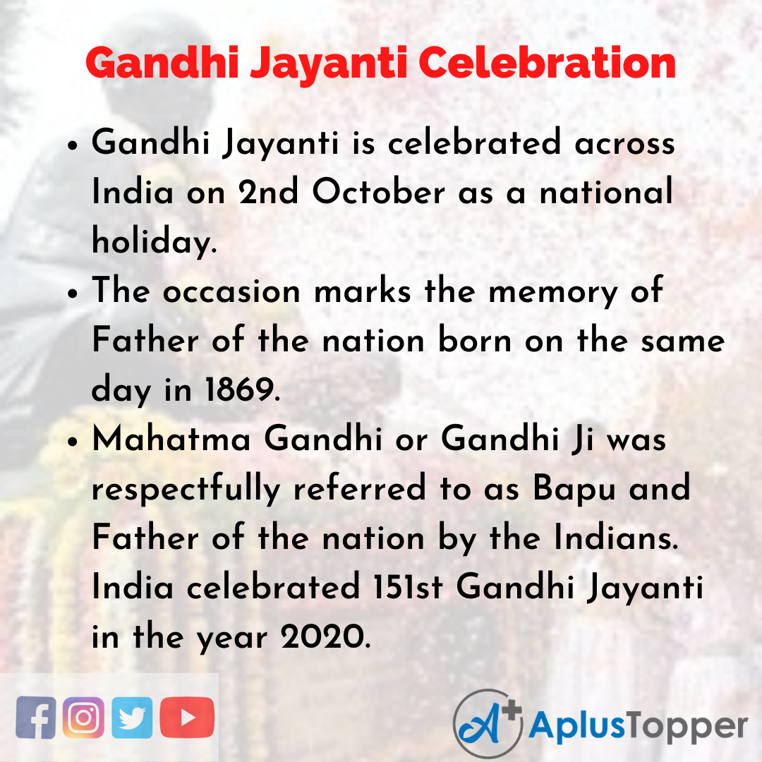 The article has four essays, and each essay on Gandhi Jayanti celebration contains several facts related to the day and the famous personality on whose honour the festival occurs. The day is also a national holiday for India, and all the organisations and institutes stay close on the day apart from the ones holding any celebration. Gandhi Jayanti celebration occurs nationwide in various manners, and most of the activities during the events revolves around the main agenda of Mahatma Gandhi, his life, and motivation drawn from his struggles and acts.