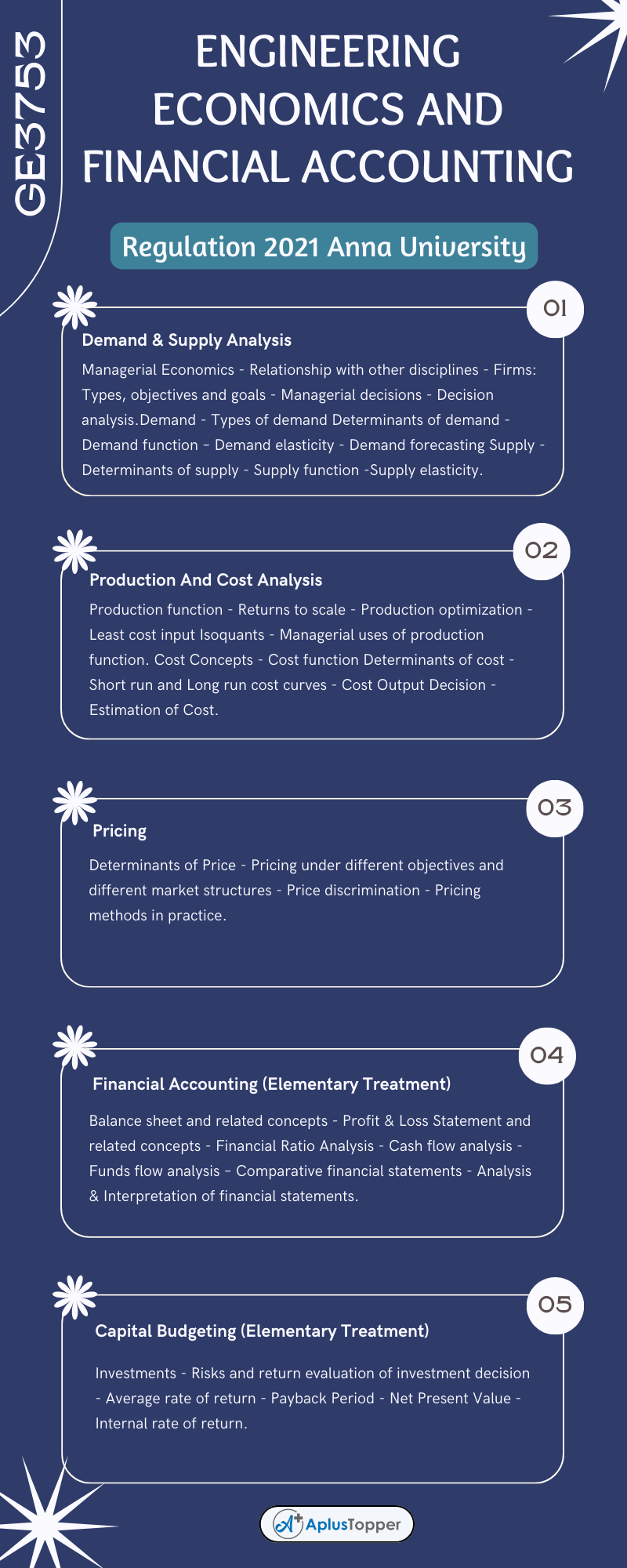 We aim to provide a detailed syllabus of GE3753 Engineering Economics And Financial Accounting. You can find unit-wise concepts and can easily make your preparations for examinations. It wouldn’t be difficult to find all the requirements in one place for the subject syllabus. This motto makes us provide this information to make it easy for you. Hope this information is useful. Don’t regret to share it with your classmates.