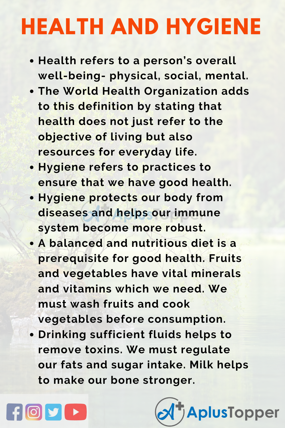 Health and Hygiene Essay: Health and Hygiene are two essential concepts when it comes to the human body. Health refers to the state of physically as well a mental well being. Health also encompasses the social well being of an individual. Health is not just about being fit but also having the appropriate resources to live. Having a sound body and mind is an indication of good health.