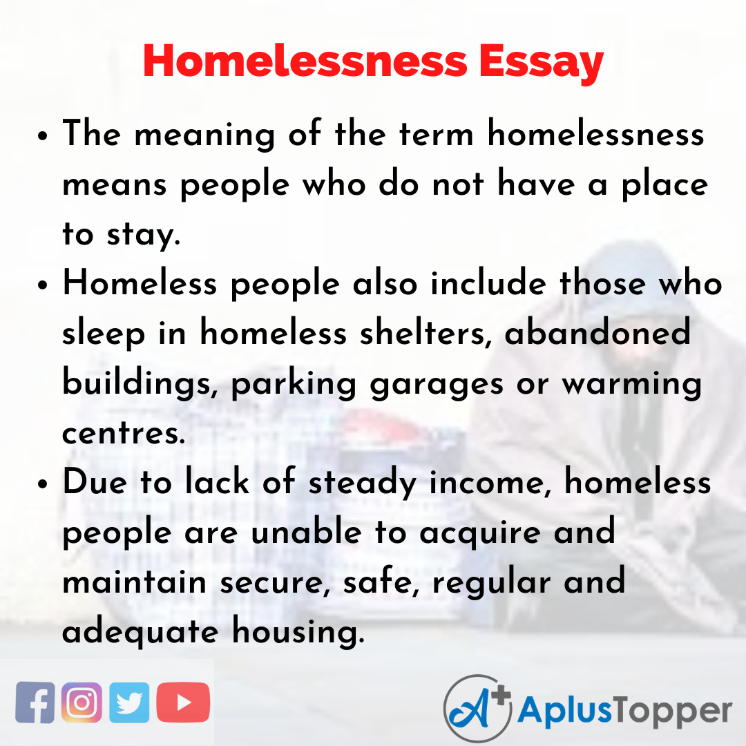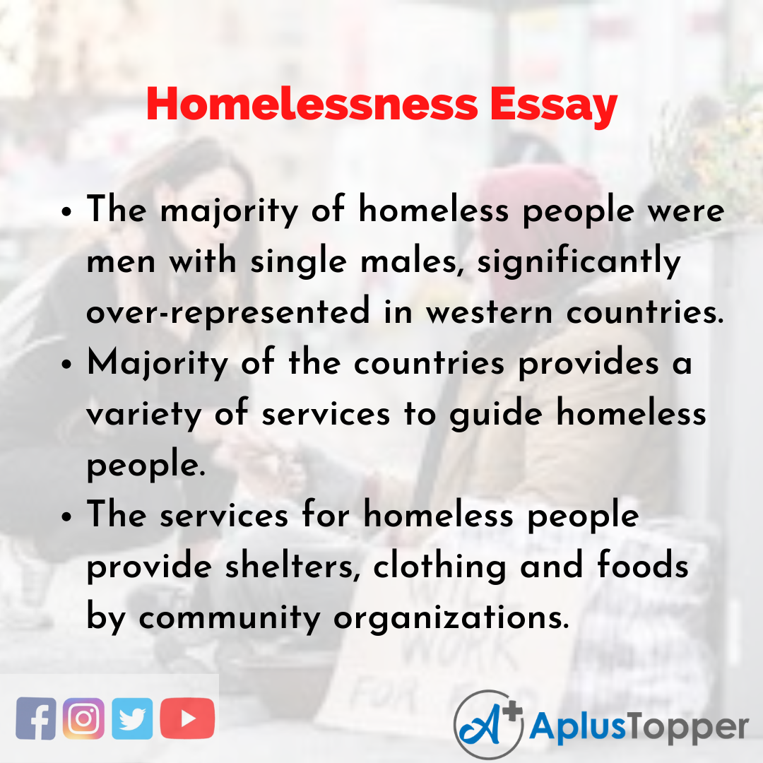 Homelessness Essay: In an individual’s life, at some point, he has heard or seen of a person who lives on the streets. A person is homeless if he lives on the streets and holds on to a sign that reads that they need money to buy food.