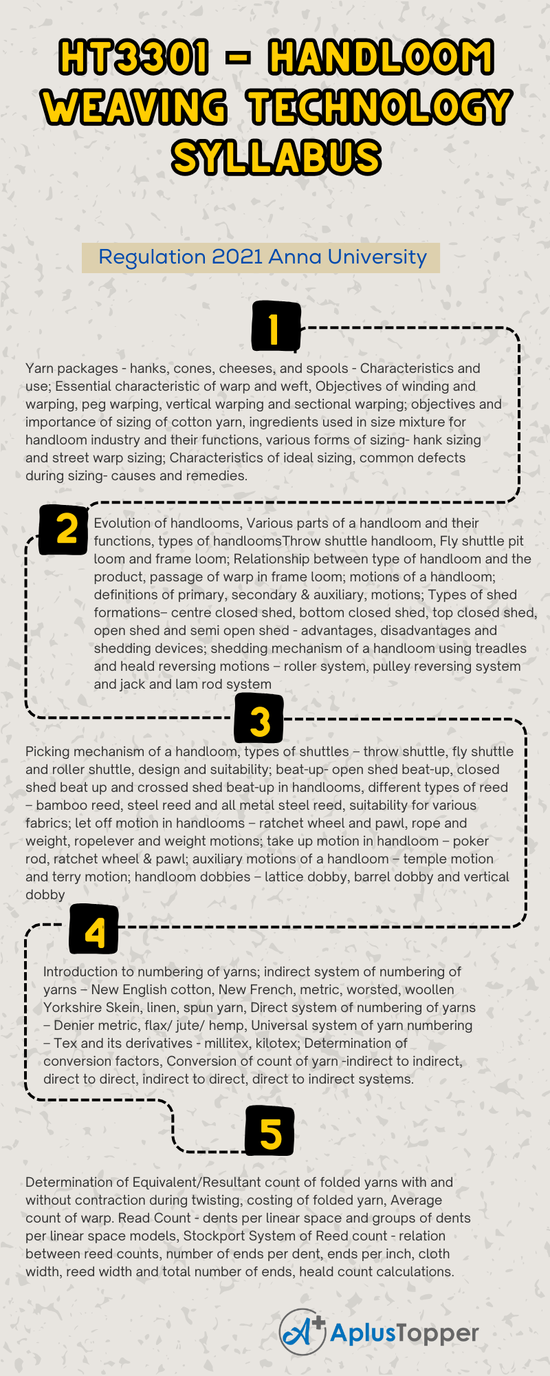 If you want to know more about the B. Tech. Handloom and Textile Technology Syllabus is connected to an affiliated institution’s four-year undergraduate degree program. We provide you with a detailed Year-wise, semester-wise, and Subject-wise syllabus in the following link B. Tech. Handloom and Textile Technology Syllabus Regulation 2021 Anna University.
