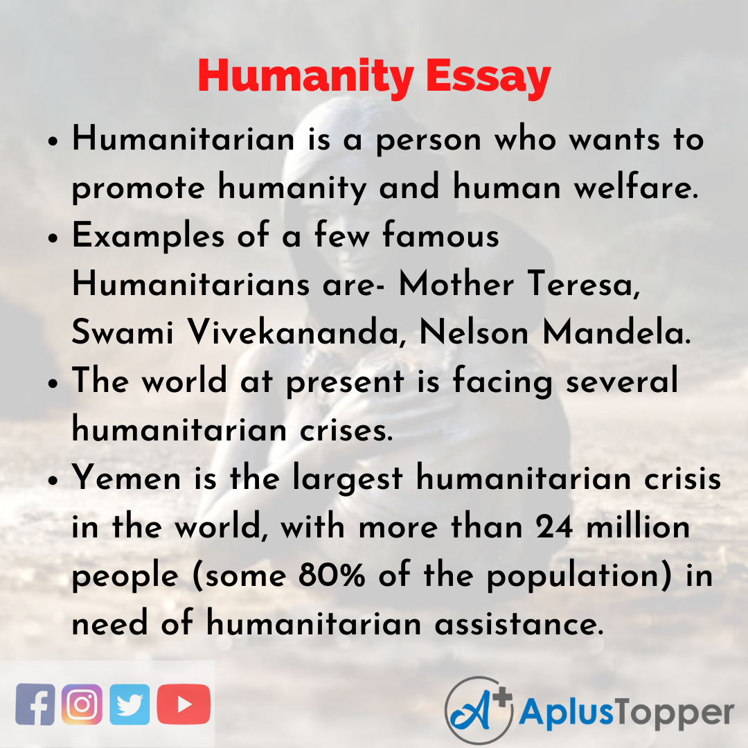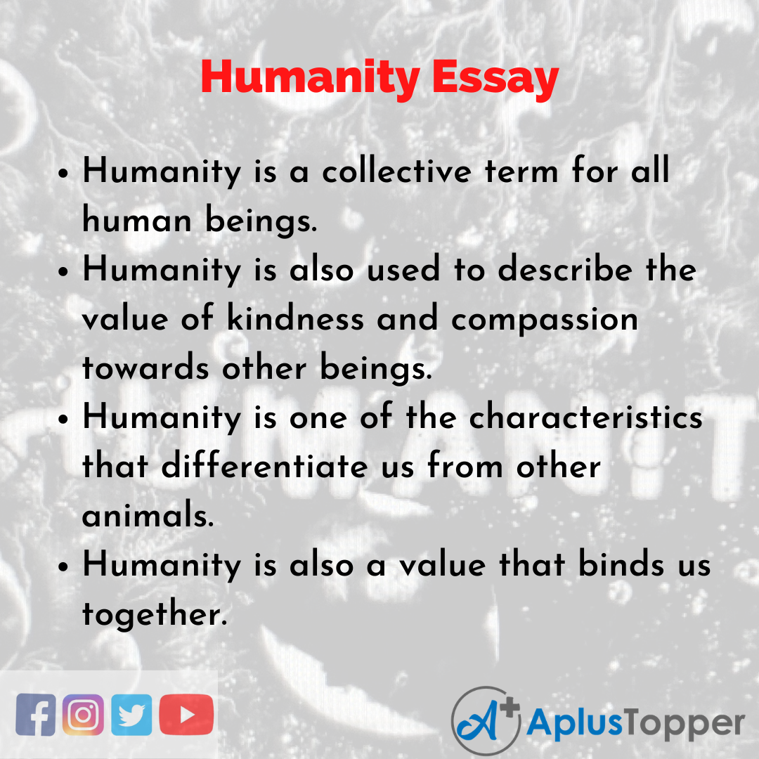 Humanity Essay: The definition of humanity would be as quality of being human; the precise nature of man, through which he is differentiated from other beings. But being human does not necessarily mean that an individual possesses humanity.