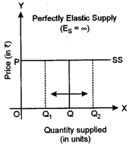 (e) Perfectly Elastic Supply : When there is an infinite supply at a particular price and the supply becomes zero with a slight fall in price, then the supply of such a commodity is said to be perfectly elastic. In such a case Es = ∞ and the supply curve is a horizontal straight line parallel to the X-axis, as shown in fig.