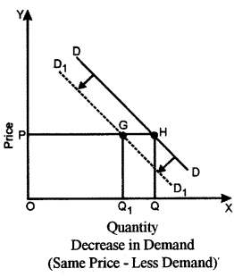 (a) A buyer will buy less commodity with fall in income for a normal good. Such a situation is known as decrease in demand. The given figure represents the situation of decrease in demand. In the figure, OP is the original price at which quantity demanded is OQ. With a fall in income demand decreases to D1 D1.
