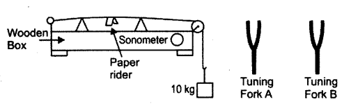 The diagram above shows a wire stretched over a sonometer. Stems of two vibrating tuning forks A and B are touched to the wooden box of the sonometer. It is observed that the paper rider (a small piece of paper folded at the centre) present on the wire flies off when the stem of vibrating tuning fork B is touched to the wooden box but the paper just vibrates when the stem of vibrating tuning fork A is touched to the wooden box.
