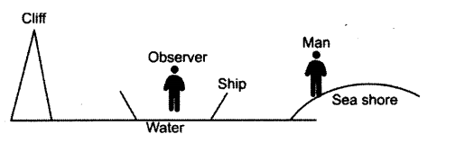 (c) A person is standing at the sea shore. An observer on the ship, which is anchored in between a vertical cliff and the person on the shore, fires a gun. The person on the shore hears two sounds, 2 seconds and 3 seconds after seeing the smoke of the fired gun. If the speed of sound in the air is 320 m s-1 then calculate: