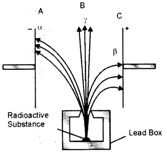 (c) Radiations given out from a, source when subjected to an electric field in a direction perpendicular to their path are shown below in the diagram. The arrows show the path of the radiation A, B and C. Answer the following questions in terms of A, B and C. [4]