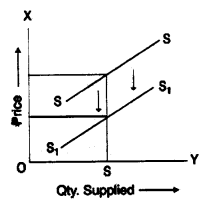 - Change in price of inputs: The supply of a commodity is also affected by change in price of inputs used in the production of good. If the price of inputs (Wages of labour, prices of raw materials and fuel) goes up, the gross cost of production will rise and as a result the supply of the commodity decreases. On the other hand, if the price of inputs declines, unit cost of production declines and as a result the supply of the commodity increases.