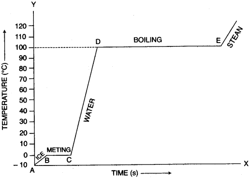 (b) A certain quantity of ice at 0°C is heated till it changes into steam at 100°C. Draw a time-temperature heating curve to represent it. Label the two phase changes in your graph. [2]