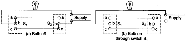 (b) Draw a labelled diagram of the staircase wiring for a dual control switch showing a bulb in the circuit. [2]