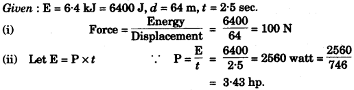 (a) 6.4 kJ of energy causes a displacement of 64 min a body in the direction of force in 2.5 seconds. Calculate (i) the force applied (ii) power in horse power (hp). (Take 1 hp = 764 W). [3]