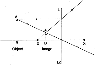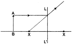 (b) (i) Copy and complete the diagram to show the formation of the image of the object AB.