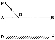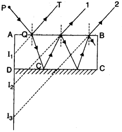 (c) (i) The diagram given alongside shows a ray of white light PQ coming from an object P and incident on the surface of a thick glass plane mirror. Copy the diagram and complete it to show the formation of three images of the object P as formed by the mirror.