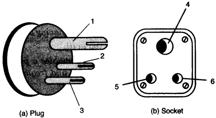 (c) (i) The diagram (a) and (b) given below are of a plug and a socket with arrow marked as 1, 2, 3 and 4, 5, 6 respectively on them. Identify and write Live (L), Neutral (N) and Earth (E) against the correct number.