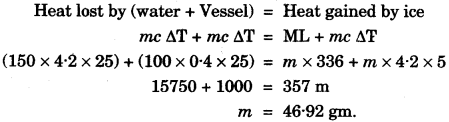 (c) Calculate the amount of ice which is required to cool 150 g of water contained in a vessel of mass 100 g at 30°C, such that the final temperature of the mixture is 5°C. (Take specific heat capacity of material of vessel as 0.4 Jg-1 °C-1, specific latent heat of fusion of ice = 336 Jg-1, specific heat capacity of water = 4.2 Jg-1 °C-1). [4]