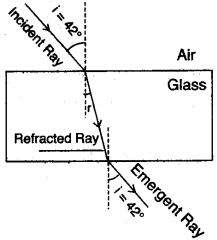 (a) A ray of light strikes the surface of a rectangular glass block such that the angle of incidence is (i) 0° (ii) 42°. Sketch a diagram to show the approximate path taken by the ray in each case as it passes through the glass block and emerges from it. [2]