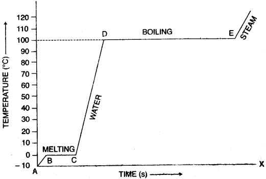 (b) A piece of ice at 0°C is heated at a constant rate and its temperature recorded at regular intervals till steam is formed at 100°C. Draw a temperature – time graph to represent the change in phase Label the different parts of your graph. [3]