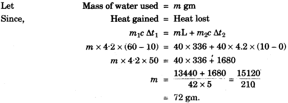 (c) 40g of ice at 0°C is used to bring down the temperature of a certain mass of water at 60°C to 10°C. Find the mass of water used.