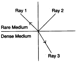 (ii) A ray of light moves from rare medium to a dense medium as shown in diagram below. Write down the number of the ray which represents the partially reflected ray. [2]