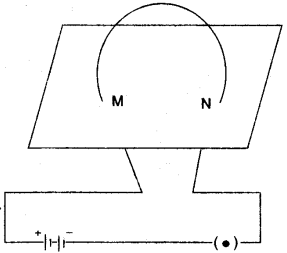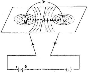 (a) The diagram below shows a current carrying loop or a circular coil passing through d’sheet of cardboard at the points M and N. The sheet of cardboard is sprinkled uni formly with iron filings.