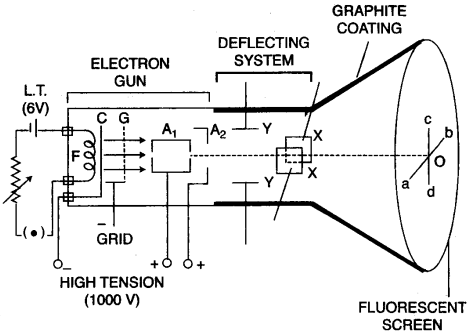 (b) (i) Draw a simplified labelled diagram of a hot cathode ray tube.