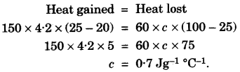 (c) A hot solid of mass 60g at 100°C is placed in 150 g of water at 20°C. The final steady temperature recorded is 25°C. Calculate the specific heat capacity of the solid. [Specific heat capacity of water = 4200 J kg-1 °C-1] [2]