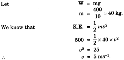 (c) (i) A moving body weighing 400 N possesses 500 J of kinetic energy. Calculate the velocity with which the body is moving. (g = 10 ms-2)