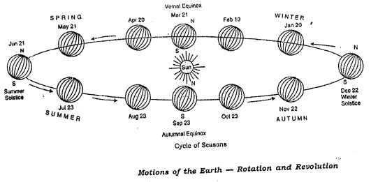 Rotation : The spinning of the Earth on its axis from West to East is called rotation. The Earth takes about 24 hours (23 hours 56 minutes 4 seconds) to complete one rotation. It is also known as daily motion of the Earth.