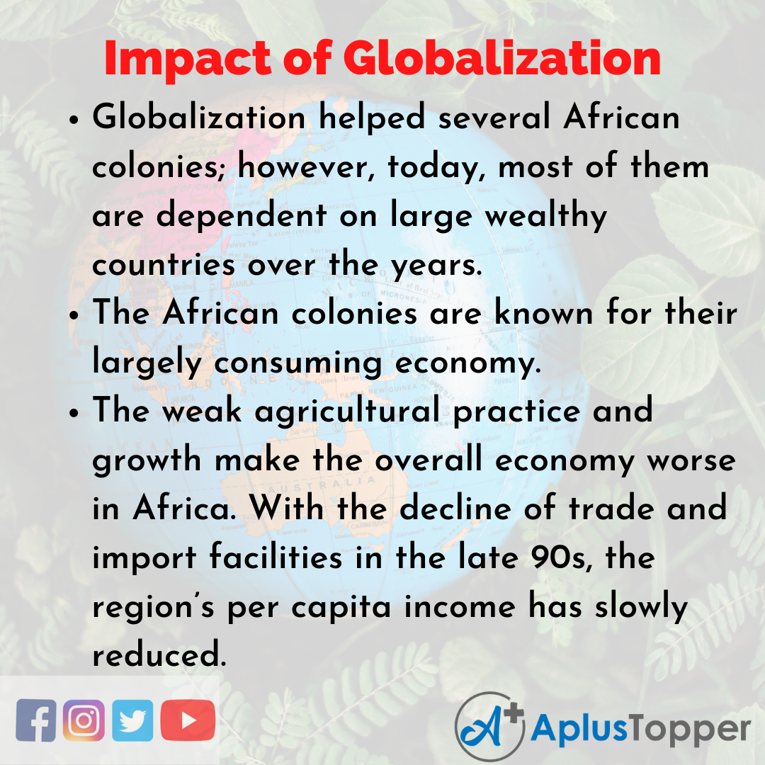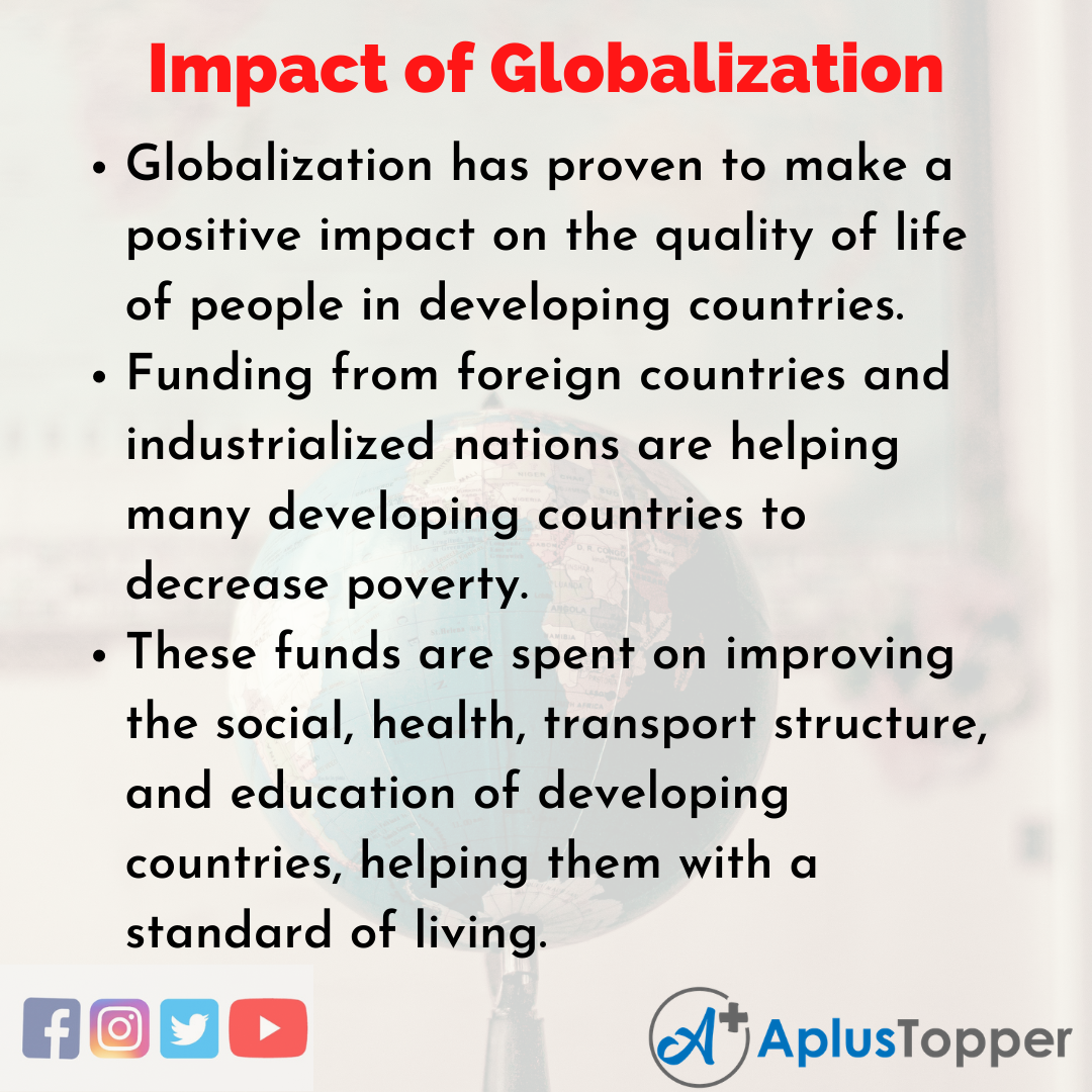 Impact of Globalization Essay: Since the decline of communalism, Globalization has become one of the most controversial and debating issues among people around the World. Globalization has a different definition to different people, and whether it has a positive impact today or was better for yesterday is still questionable. Although a part of the population questions its existence, it has significantly impacted both developed and developing countries’ economies. Globalization cannot simply be related to being political as it has had significant effects on cultural, ideological, and social aspects of people around the World.