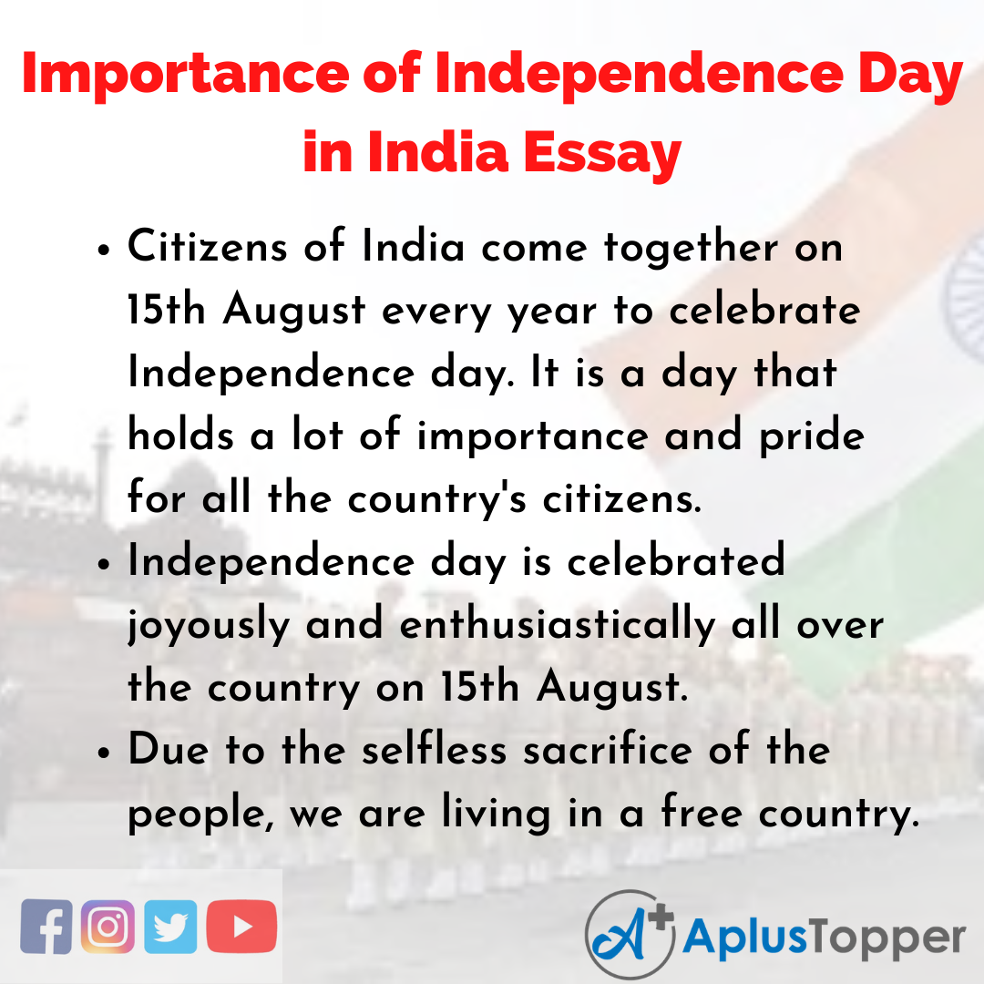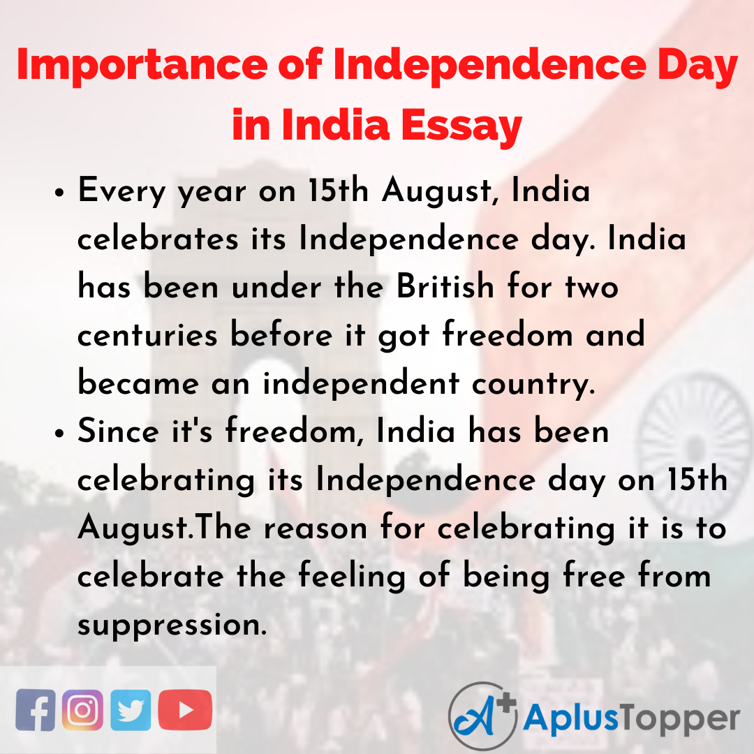 Importance of Independence Day in India Essay: India celebrates 15th August every year as its Independence day. It is the day the country got freedom from its’ oppressors, the British government. Independence Day holds a special place in the hearts of all Indians.