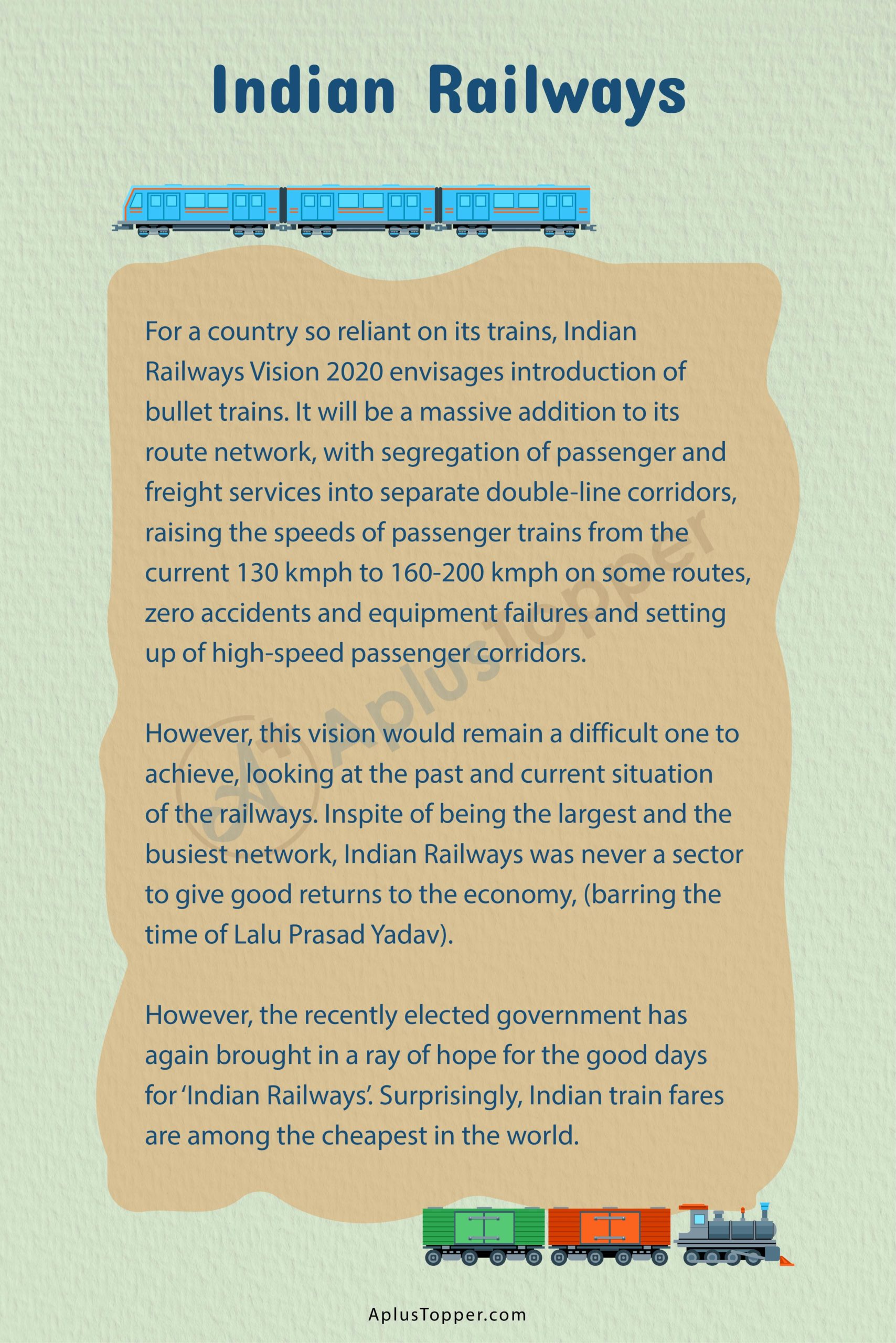 Indian Railways Essay: Indian Railways is one of the largest railway networks operated by the Government of India. Railways was first introduced in India in 1853. Today, its operations cover 29 states and 7 union territories, and also provides international services to its neighbours, Nepal, Bangladesh and Pakistan. It is also one of the busiest rail networks in the world, carrying about 18 million passengers daily. Moreover it is the world’s largest employer, providing jobs to millions.