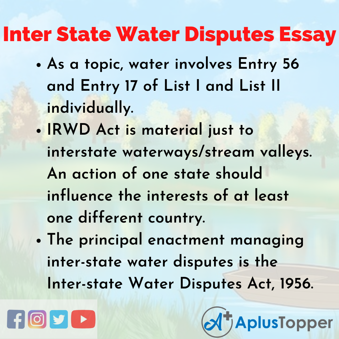 Moreover, you can now access more Essay Writing on this topic and many more. While Entry 17 of List II gives the State Legislature select capacity to administer on water-related infrastructural ventures like water system, waste, stockpiling, and force; that force is dependent upon Entry 56 of List I, which gives the Parliament elite power despite anything in the Constitution, to enact on guideline and advancement of inter-state waterways and stream valleys as has been pronounced by law to be in the public interest. The principal enactment managing inter-state water disputes is the Inter-state Water Disputes Act, 1956.