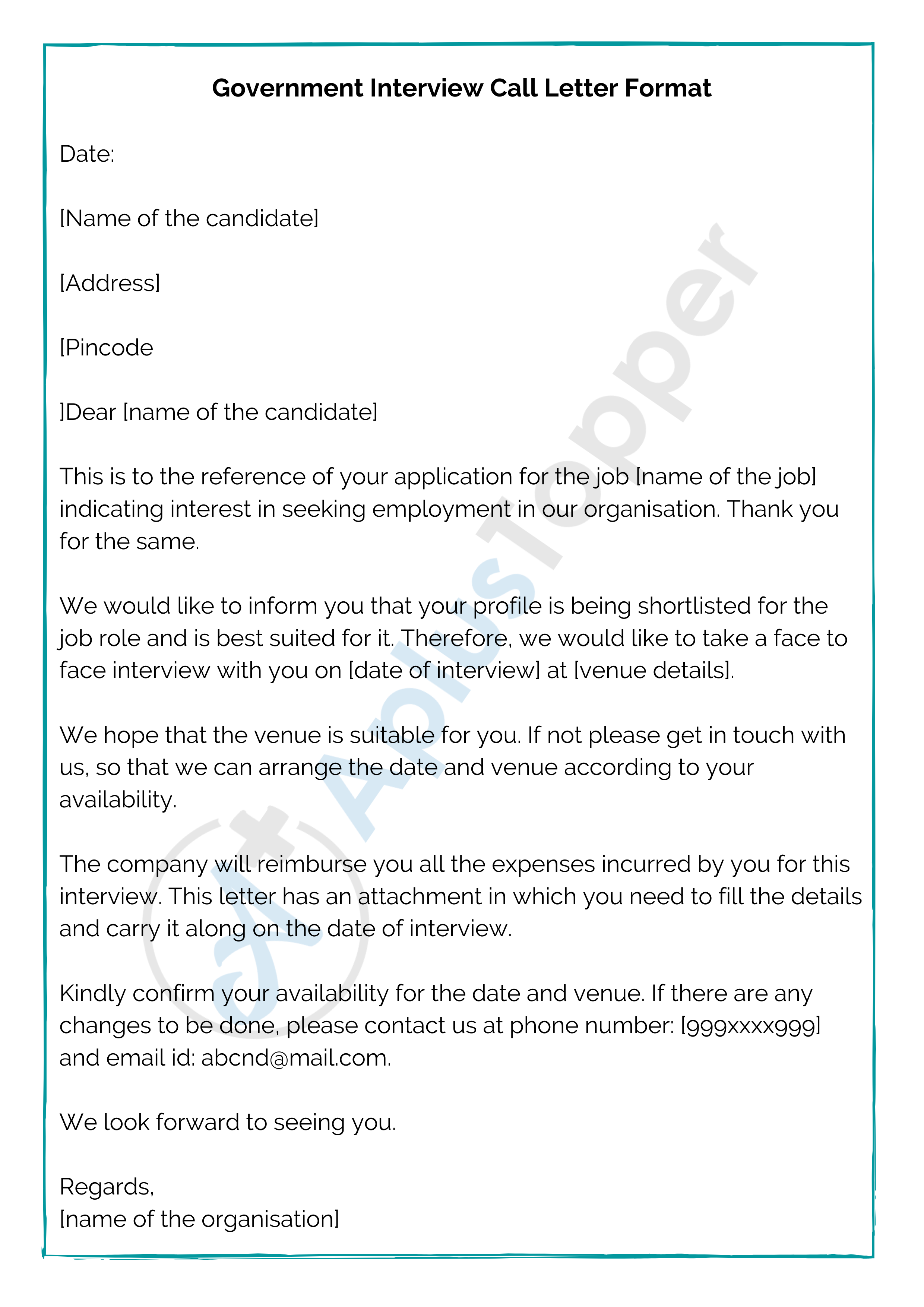 The government interview call letter for any job or vacancy is confidential and highly secured. Government call letters are usually received via post and sometimes by mail. The letter is formal and they have a specified format for such letters. These letters are sent by government officials/authorities only. All the call letters will have the stamp of the organisation.