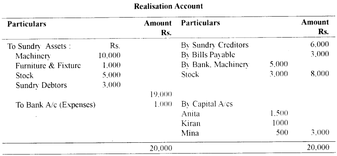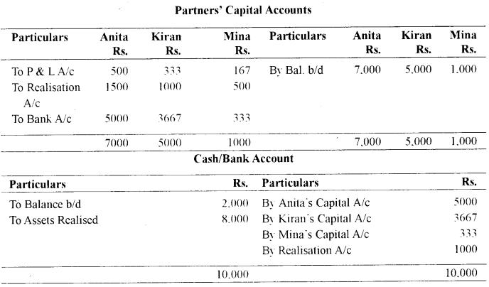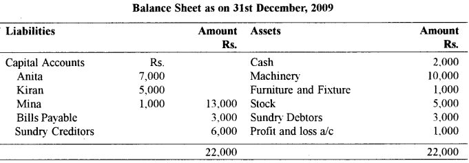 Anita, Kiran and Mina were partners sharing profits and losses in the ratio , of 3:2: 1. They decided to dissolve the partnership due to insolvency of all the partners. Their Balance Sheet as on 31st December, 2009 was as follows :
