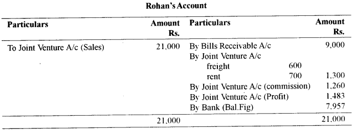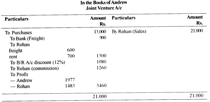 Andrew and Rohan entered into a joint venture and agreed to share profits and losses in the ratio of 4:3. Andrew supplied goods worth Rs. 13,000 from his own stock. He spent Rs. 900 on freight and insurance and drew a bill on Rohan for Rs. 9,000 for three months. Rohan accepted the bill which was discounted by Andrew @ 12%p.a. Rohan paid Rs.600 tow ards clearing charges and Rs.700 for rent. Goods were sold by Rohan for Rs.21,000. Rohan was entitled to a commission of 6%. Rohan sent the draft to Andrew towards settlement of his account