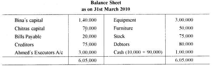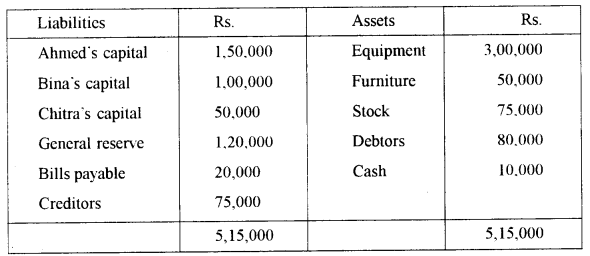Ahmed. Bina and Chitra are partners sharing profits and losses in the ratio of 3 : 2 : 1. Their balance sheet as on 31st March 2010 stood as under :