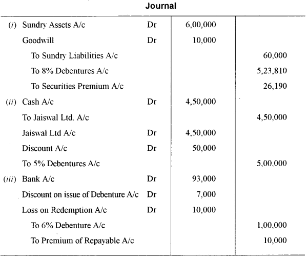 (i) Gurung Ltd. took over assets of Rs. 6,00,000 and liabilities of Rs. 60,000 from Batra Ltd. for the purchase consideration of Rs. 5,50,000. It paid the purchase consideration by issuing 8% debentures of Rs. 100 each at 10% premium.